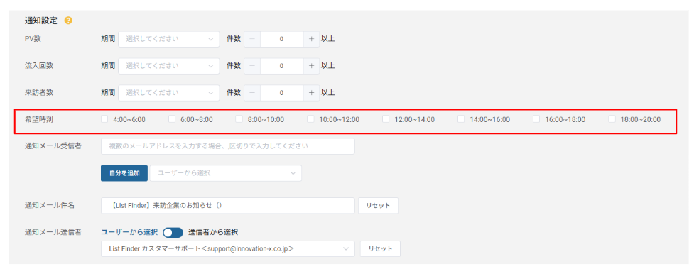 ※通知メールは前回配信から希望時刻までにアクセスがあった個人の来訪をお知らせします。