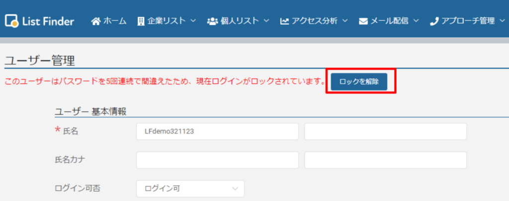 ③[ユーザー情報]画面で[ロックを解除]をクリックします。