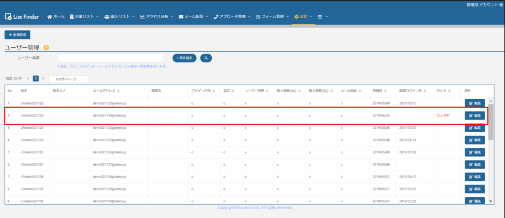 ②ロックされているユーザー名の[編集]をクリックします。