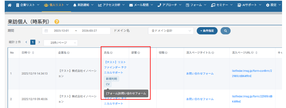[来訪企業(時系列)]および[来訪個人(時系列)]画面において、コンバージョンした企業や個人にCVマークが表示され、CVマークにマウスオーバーすると、コンバージョン名が表示されます。