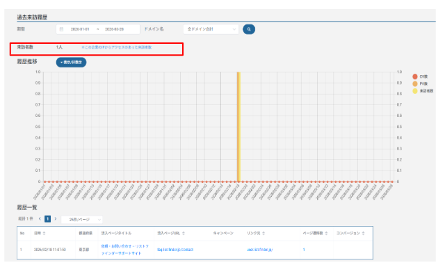 また、履歴一覧にて、来訪日時や閲覧ページを確認することができます。