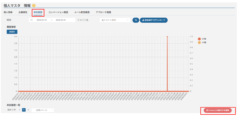 ブラウザと個人マスタの紐付きがおかしいことがわかった場合は、個人マスタ情報画面の来訪履歴にございます「Cookieとの紐付きを解除」ボタンをクリックすれば、ブラウザと個人マスタの紐付きが解除されます。